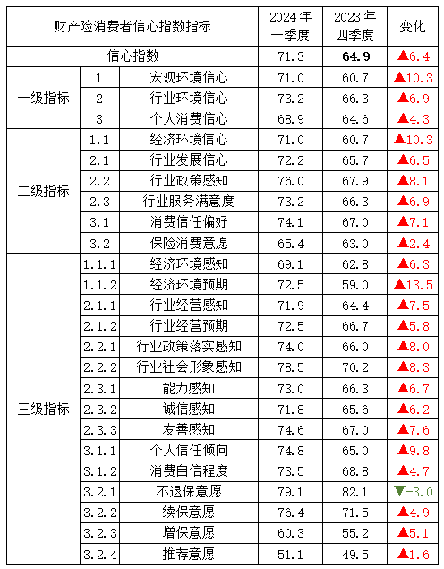 財(cái)產(chǎn)險(xiǎn)方面,一季度財(cái)產(chǎn)險(xiǎn)消費(fèi)者信心指數(shù)為71.3,環(huán)比上升6.4,同比下降2.8,升至信心較強(qiáng)區(qū)間,細(xì)分指標(biāo)呈現(xiàn)以下變動(dòng)趨勢: